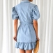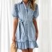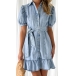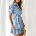 This denim dress features a stand collar, short sleeves, front buttoned and self-tie waistline, this dress exudes a casual yet chic vibe.