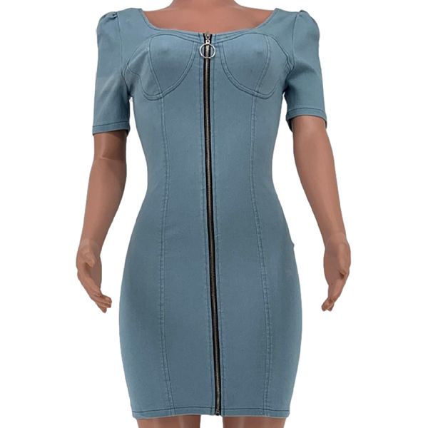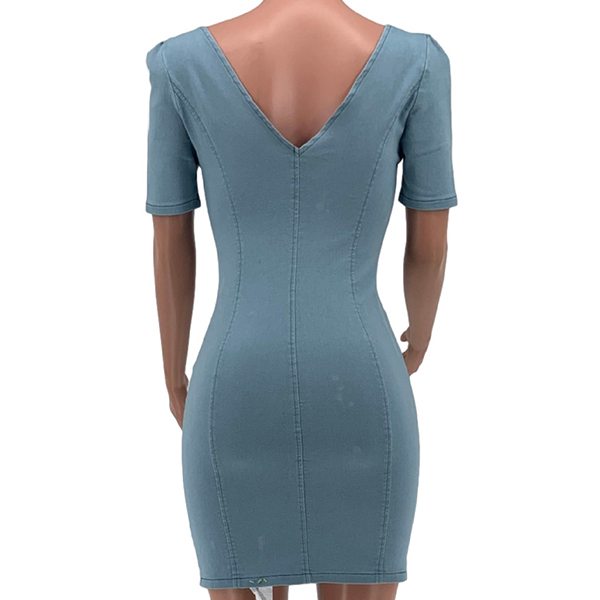 Fashion Old-washed V-neck Short Sleeve Zipper Bodycon Denim Dress
