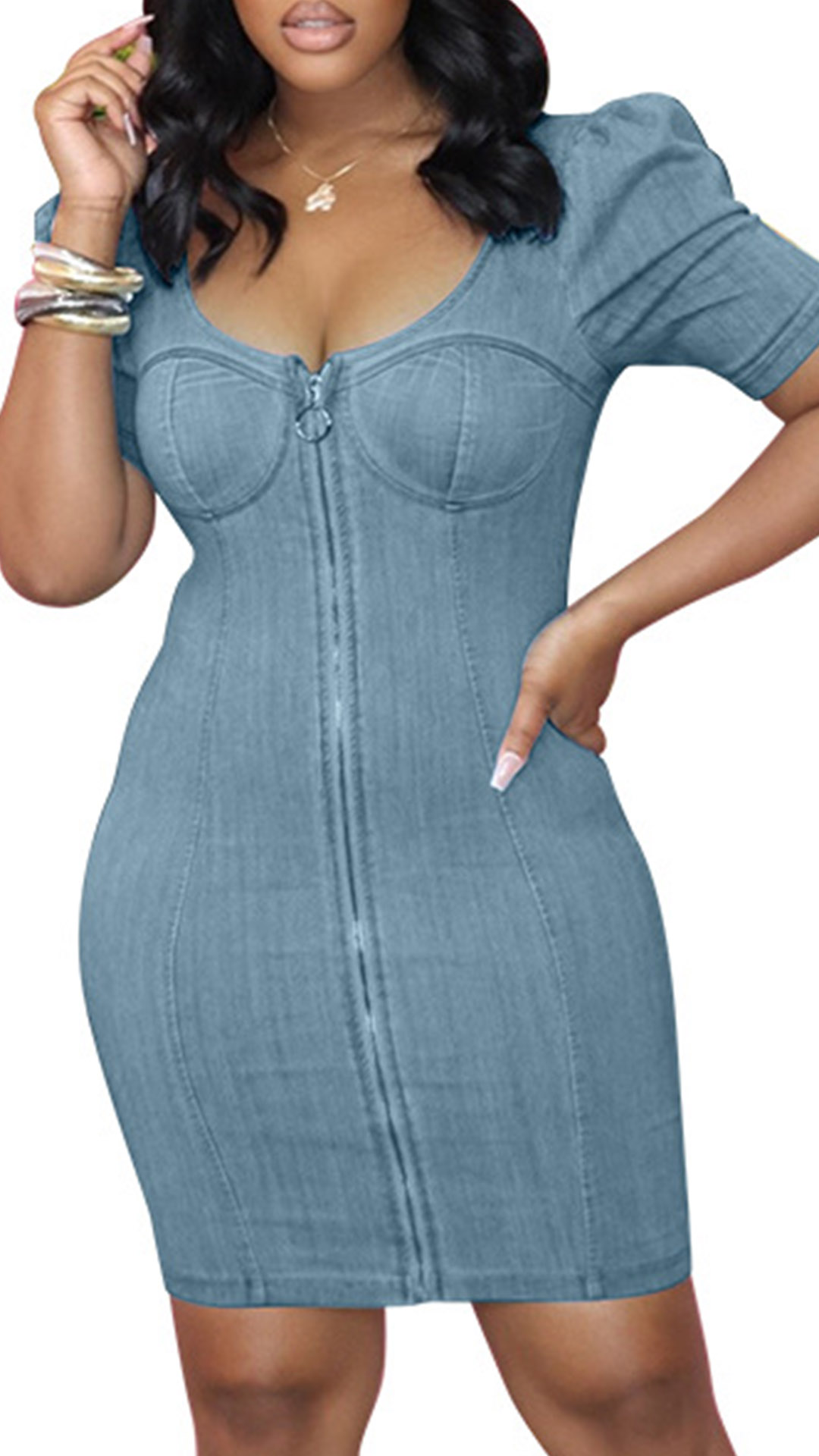 This denim dress features a flattering V-neckline, short sleeves and front zipper details, which creating a modern and feminine look. Wanna have one?