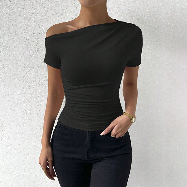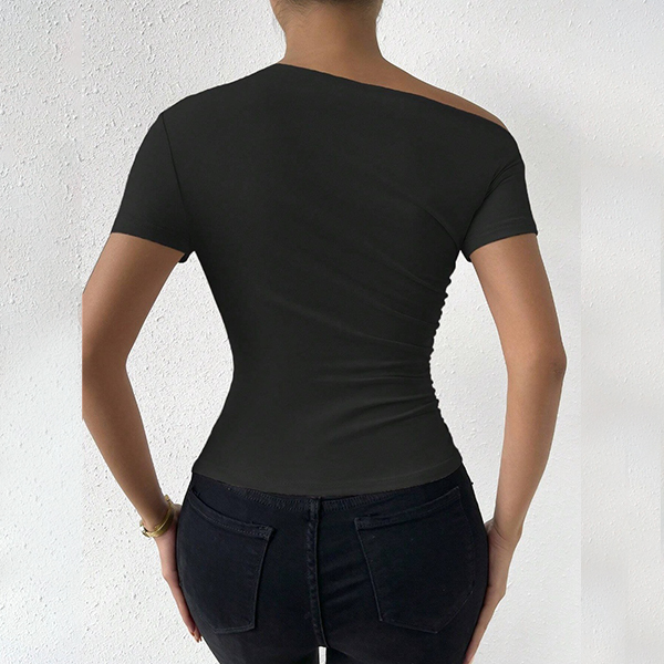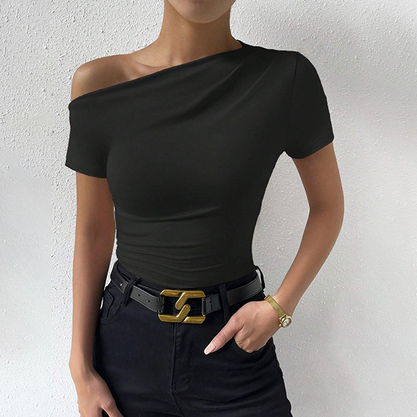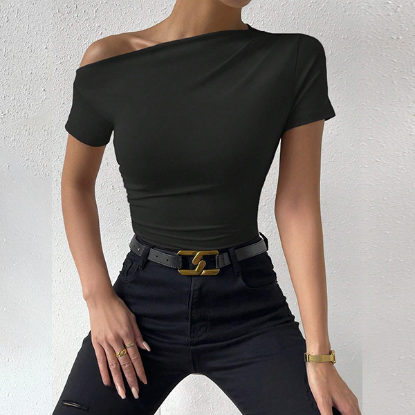 This stylish and contemporary shirt features a one-shoulder design, short sleeves, and a slim-fit silhouette. You could pair it with a high-waisted jeans, tailored trousers, or a skirt for a stylish and versatile look.