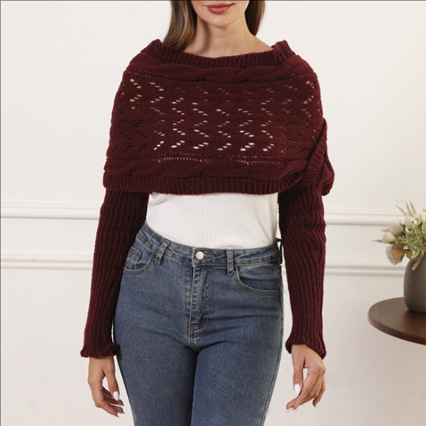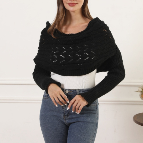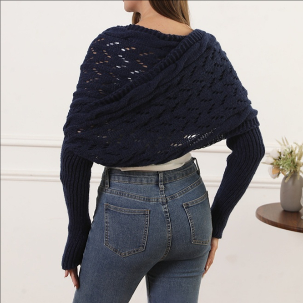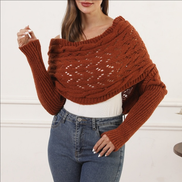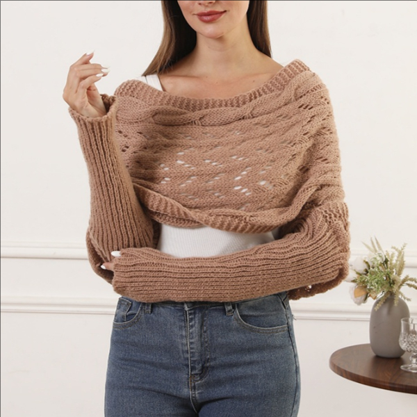 This versatile knitted piece combines cozy shrug styling with elegant sweater detailing for layering sophistication. The open-knit construction creates airy texture whilst the scarf element adds flowing movement and versatile styling options.The shrug format brings effortless elegance whilst the scarf detail ensures versatile coordination with multiple outfits. Multi-colors avabile.