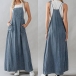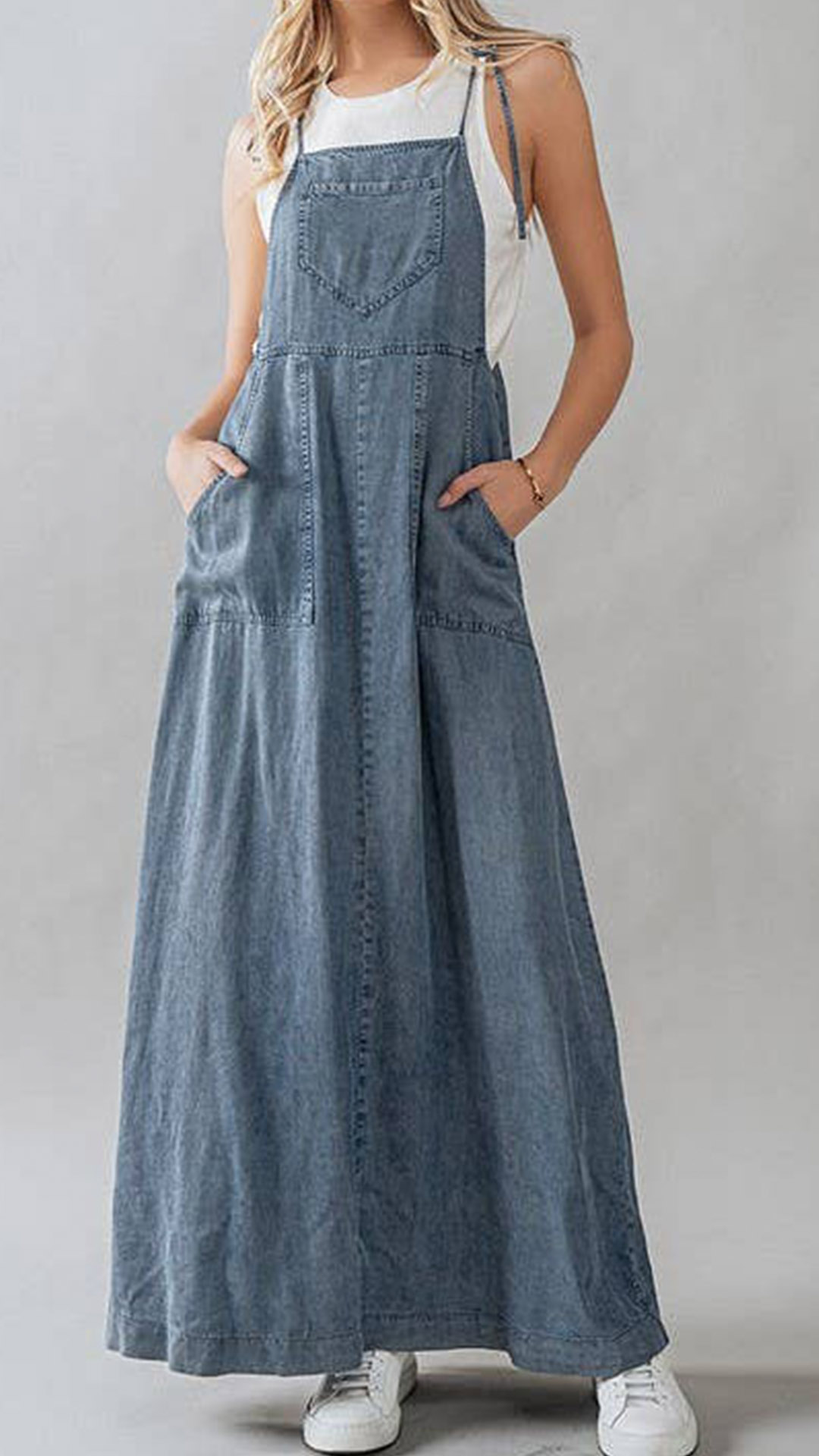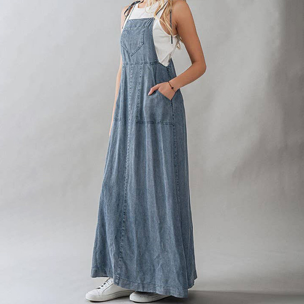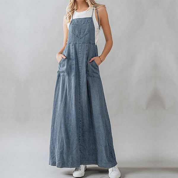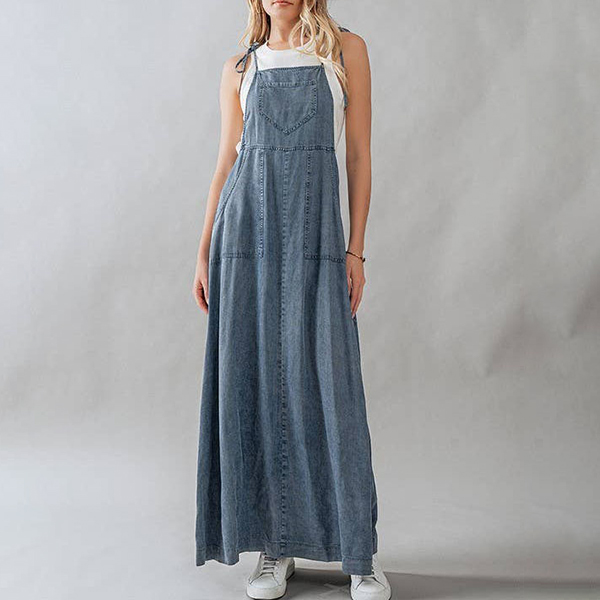 This is a trendy and versatile denim dress that exudes a laid-back yet chic vibe. It features patch pockets that add a utilitarian and practical touch to the design. The self-tie shoulder straps offer a unique and customizable detail. It is perfect for a day out shopping, a casual lunch with friends, or a weekend stroll, this denim dress is designed to make you feel stylish and effortlessly chic.