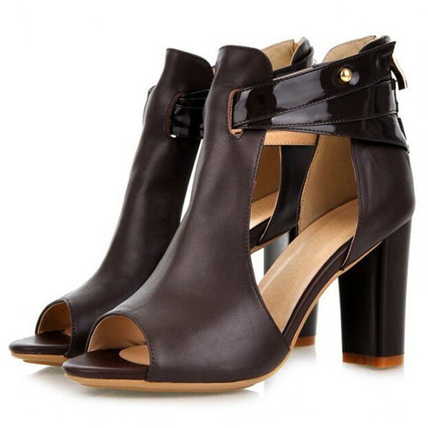 high polish faux PU leather and set on a comfortable block heel, features a side cutout design for