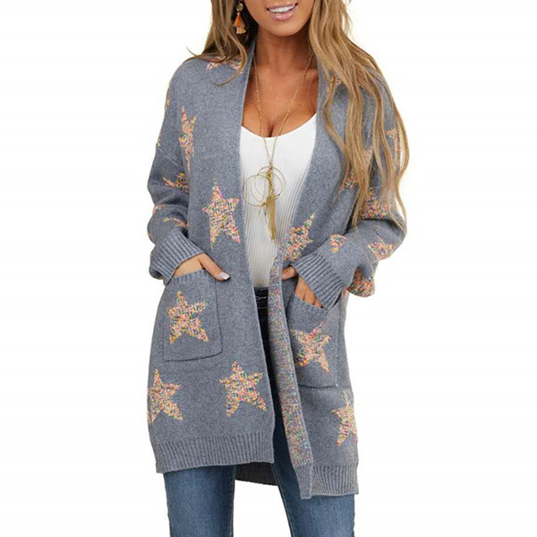 You will not move your eyes from this knit cardigan at your first sight.Designed with the lovely pentagram printed details,which make this piece look more stylish and attractive.Match it with your favorite necklace,tight bottomed tops and jeans,it will not let you down.