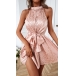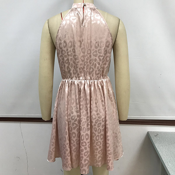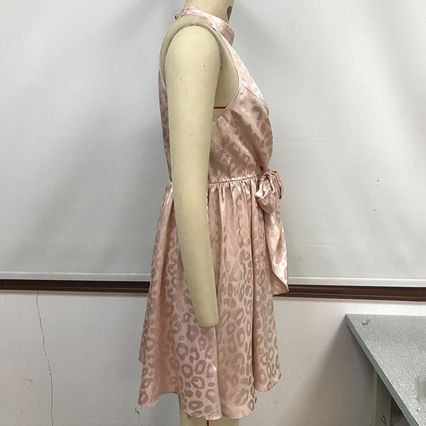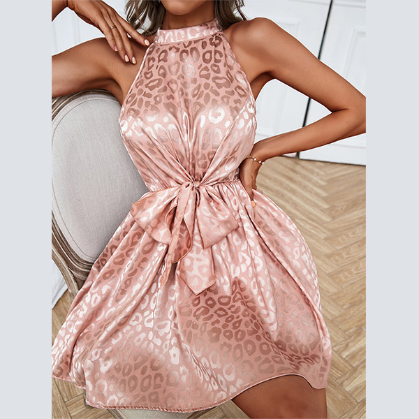 A pink leopard print dress with a bowknot at the waist, and a mini length.