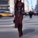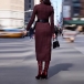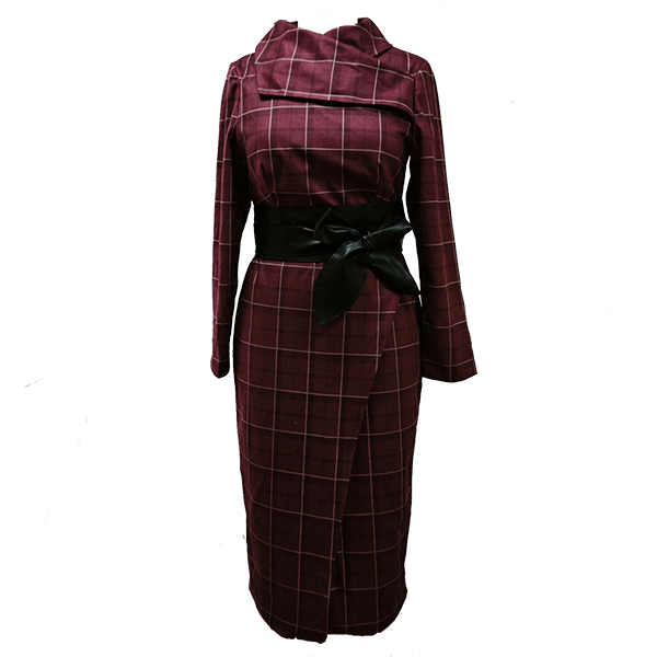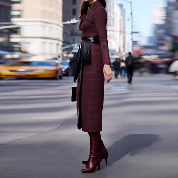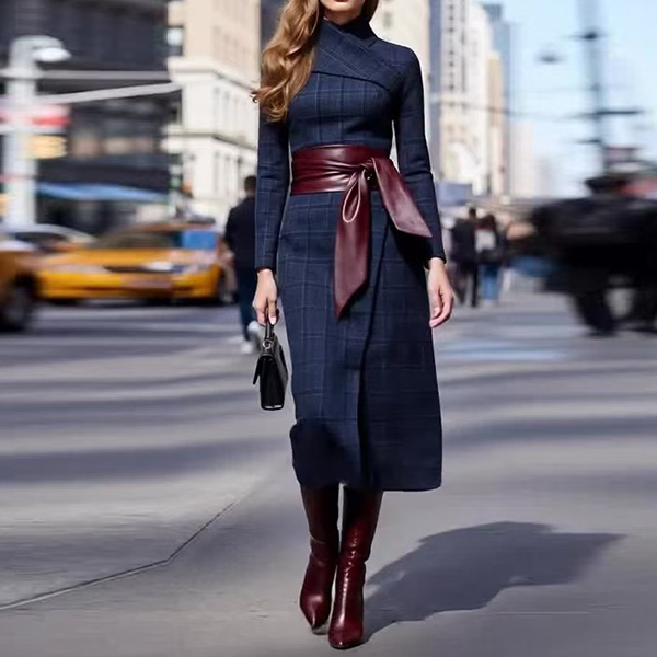 Fashion Plaid Mock Neck Long Sleeve Side Slit Self-tie Dress
