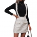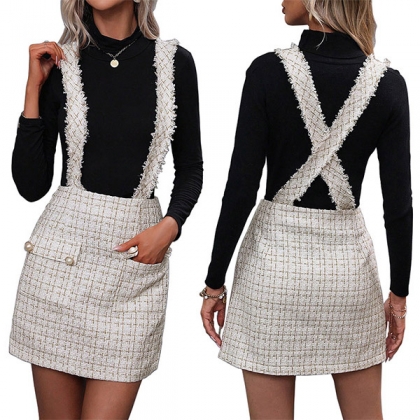 Fashion Plaid Pearl Patch Pockets Suspender Skirt