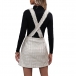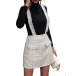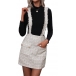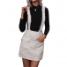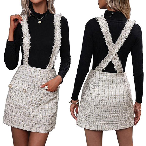 This suspender skirt features a plaid pattern with pearl patch pockets, creating a chic and stylish look. Pair it with a blouse or a sweater for a sophisticated look.