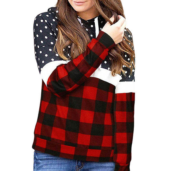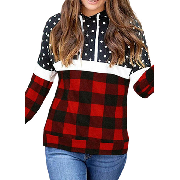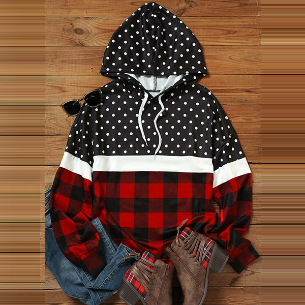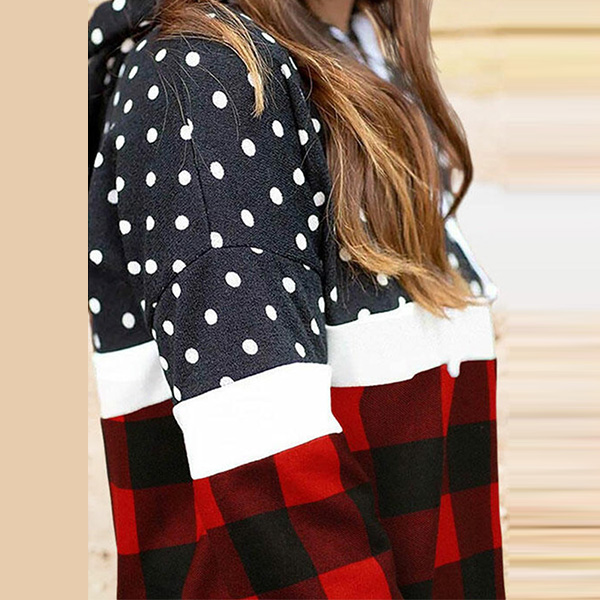 Fashion Plaid Spliced Long Sleeve Hooded Dots Printed Sweatshirt