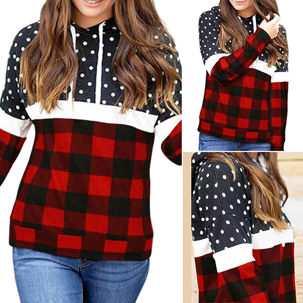 Exhibit your casual and stylish sense with this sweatshirt. The combines of plaid and dots element make this piece look so eye-catching,while the long sleeve and hooded silhouette design maintain the classic design style. We suggest you matching with a jeans to have a laid-back and fashionable autumn look.