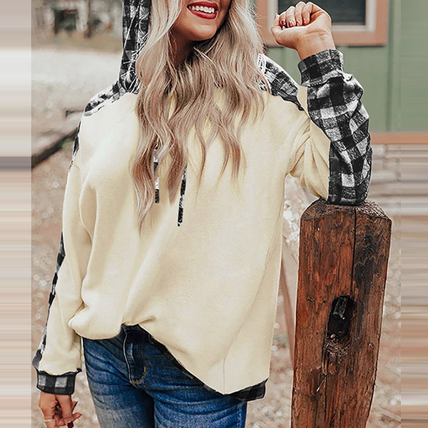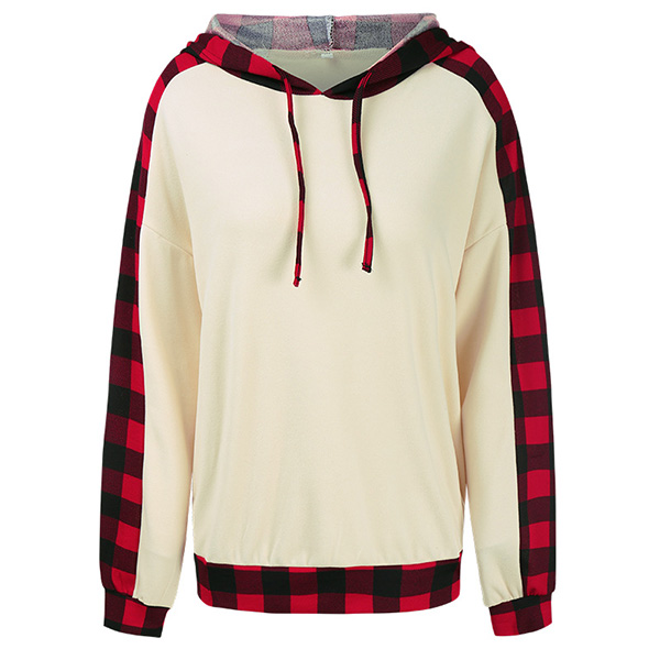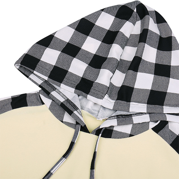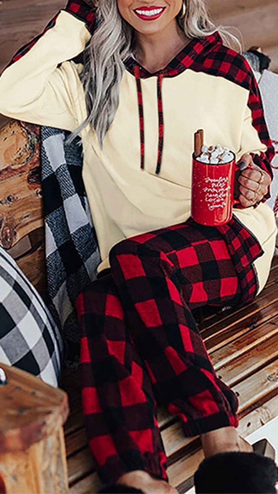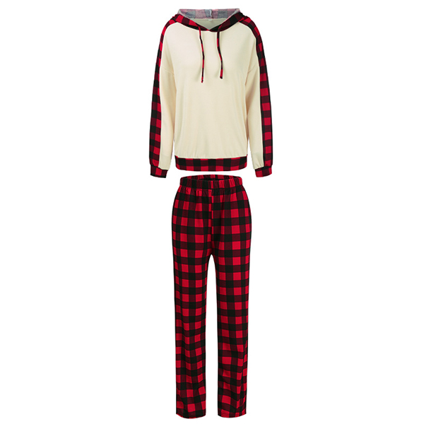 Fashion Plaid Spliced Long Sleeve Hooded Sweatshirt + Pants Sports Suit