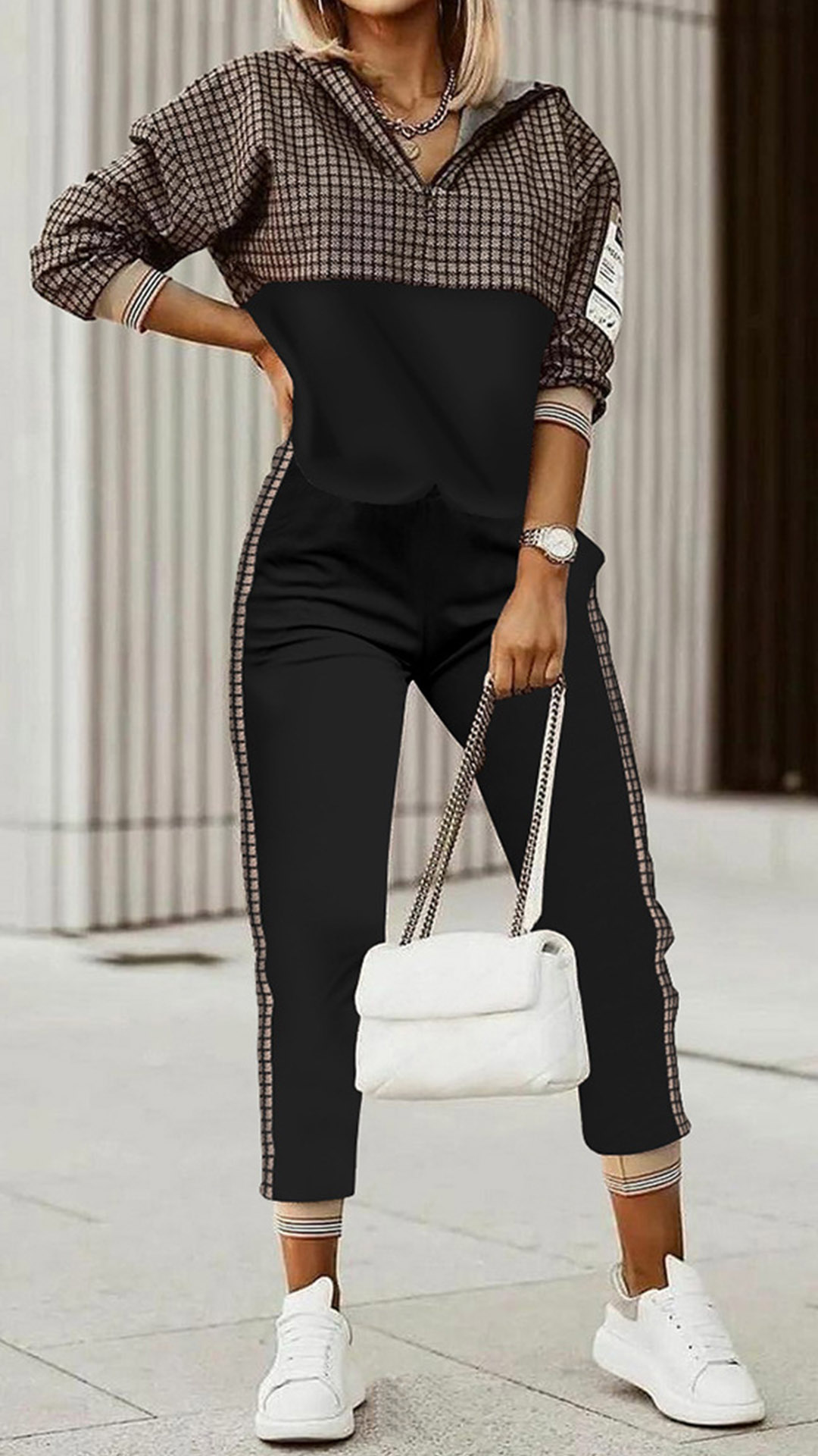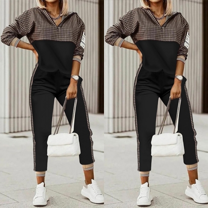 Fashion Plaid Spliced Long Sleeve Hooded Sweatshirt + Pants Sports Suit