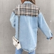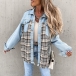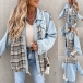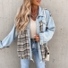 Fashion Plaid Spliced Long Sleeve POLO Collar Single-breasted Frayed Hem Denim Jacket