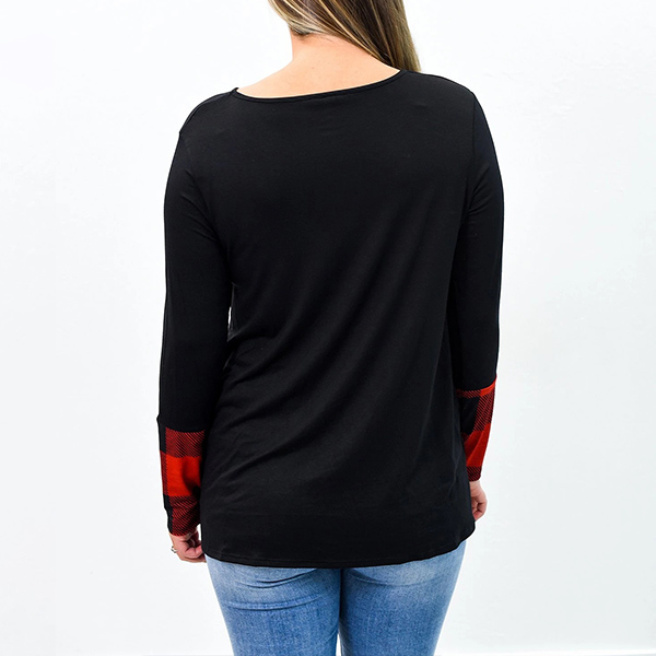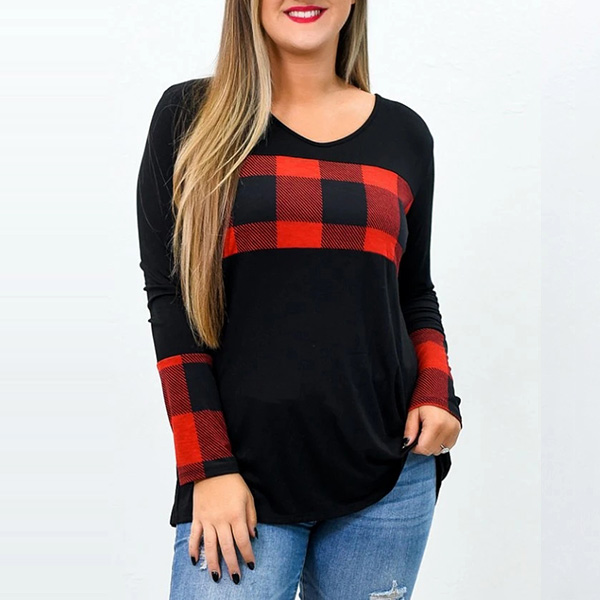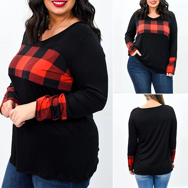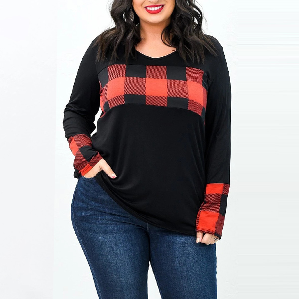 Fashion Plaid Spliced Long Sleeve Round Neck Plus Size T-shirt