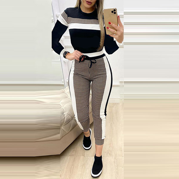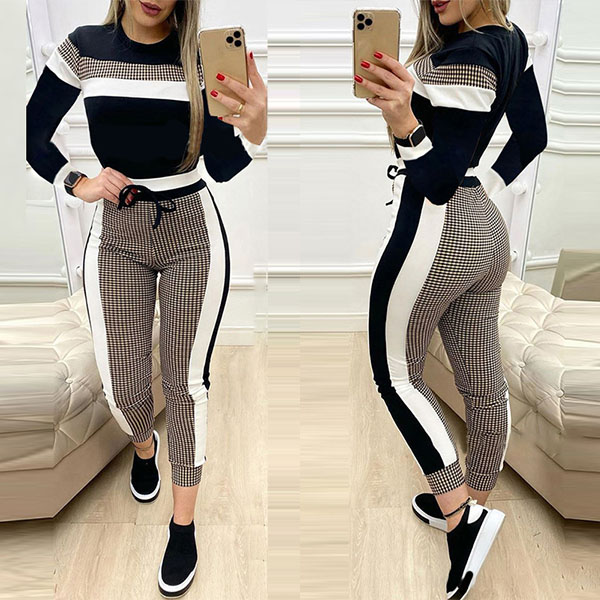 Fashion Plaid Spliced Long Sleeve Round Neck Top + Pants Two-piece Set