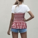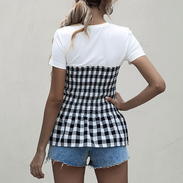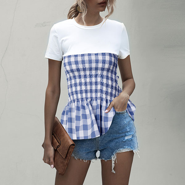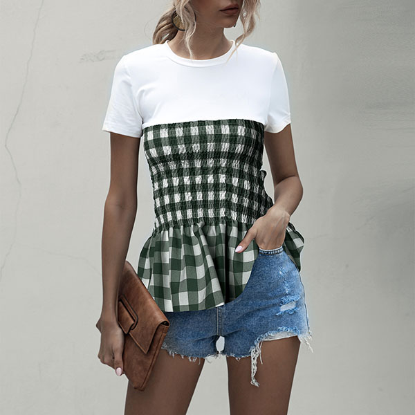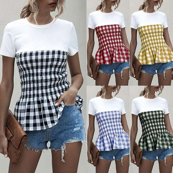 Don't like too simple and dull t-shirt? Then this piece can easily arouse your attention. The plaid spliced details and ruffle hem design make this piece look so stylish and attractive. Finished with short sleeve and round neck design,this piece can offer you a stylish look while it keeps the comfy.