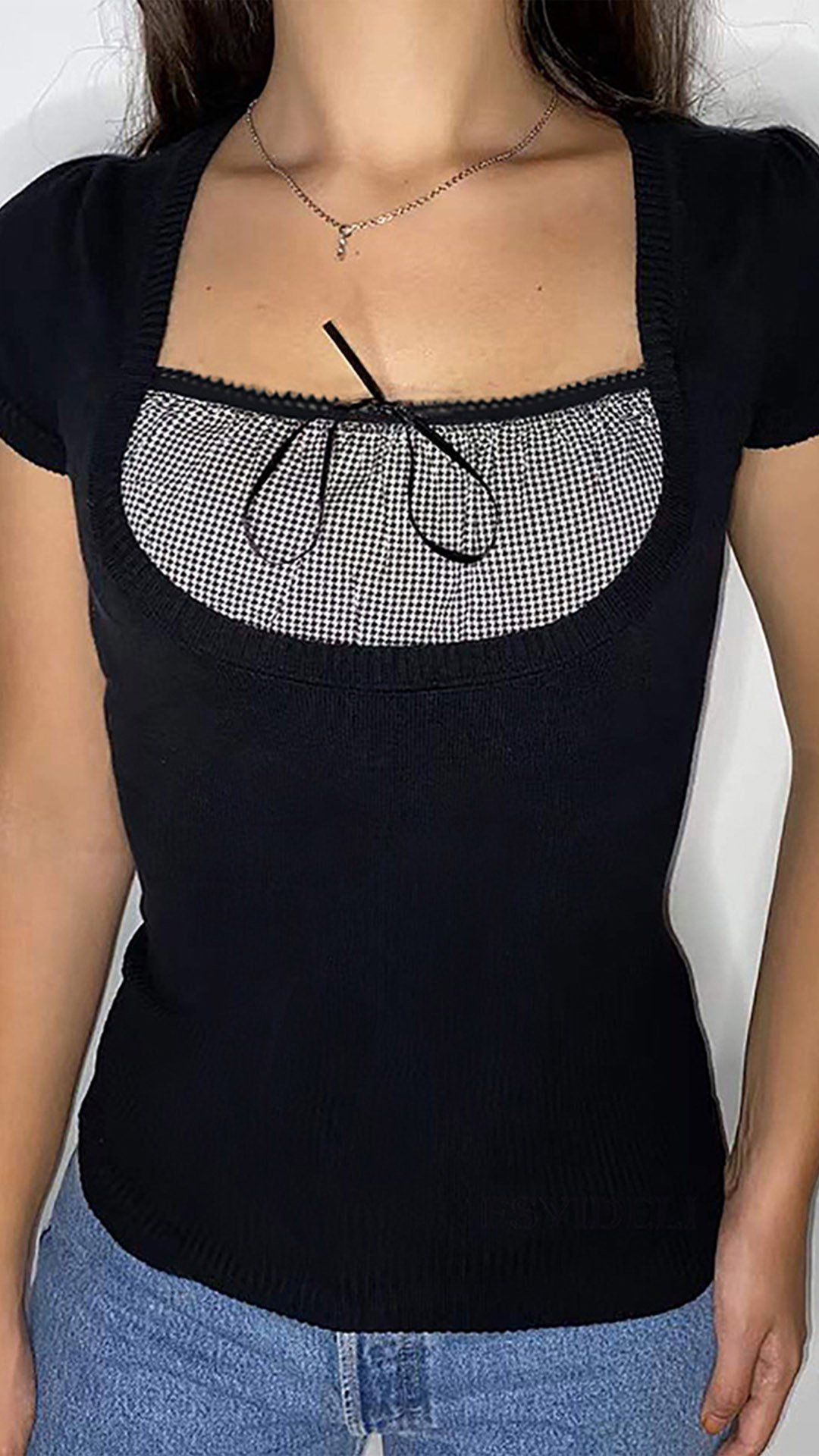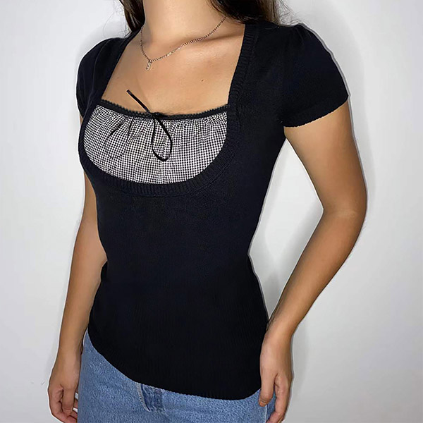 For the summer days,this short sleeve t-shirt can easily arouse your attention. The square collar and plaid spliced details make this piece full of sassy and flirty vibes,while the fit silhouette design can showcase your perfect body-line. You can match with your favourite bottoms to start your wonderful days.