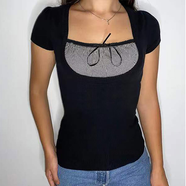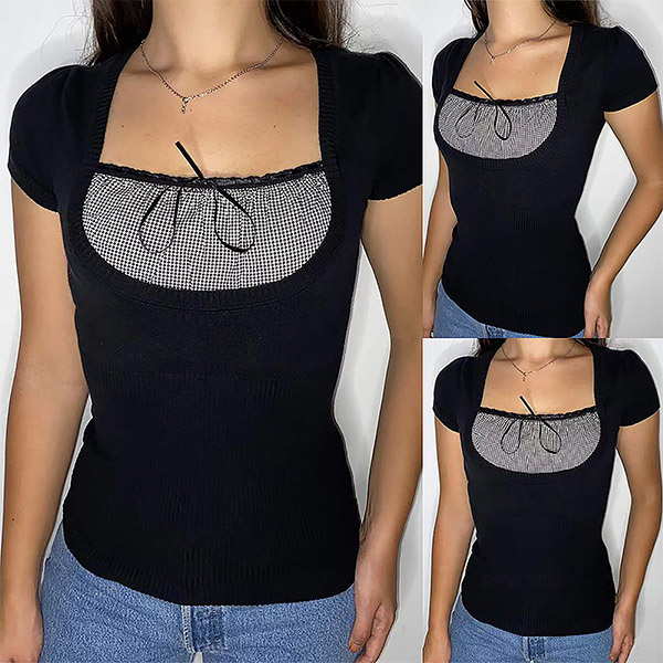 Fashion Plaid Spliced Square Collar Short Sleeve Slim Fit T-shirt