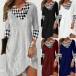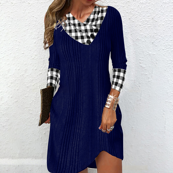 Fashion Plaid Spliced V-neck Long Sleeve Ribbed Dress