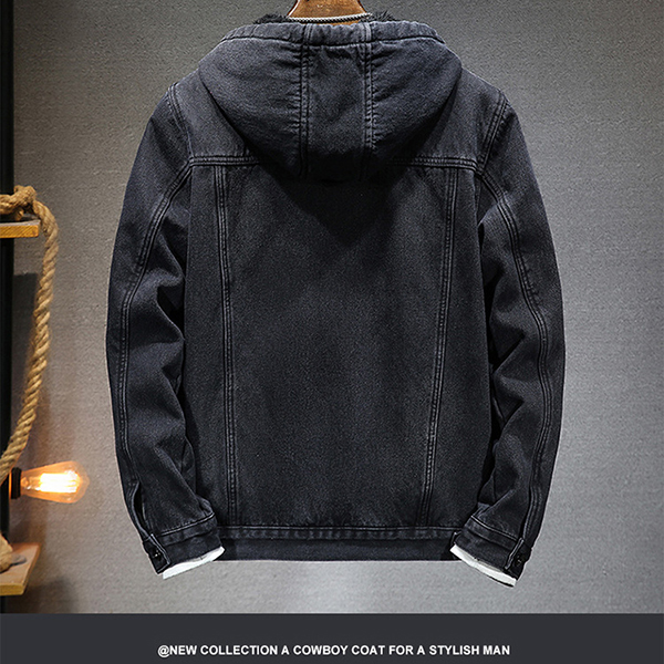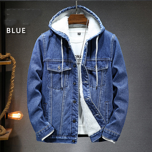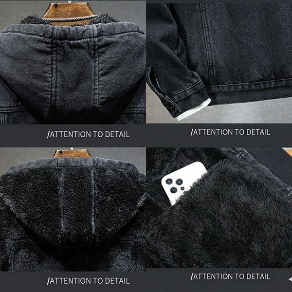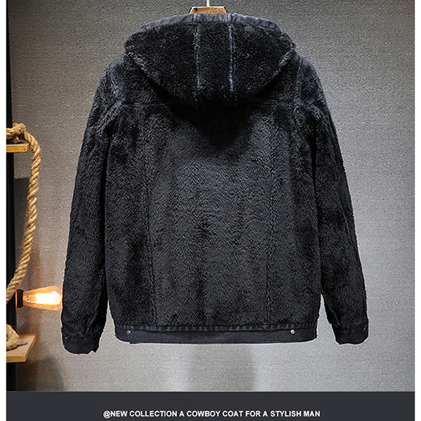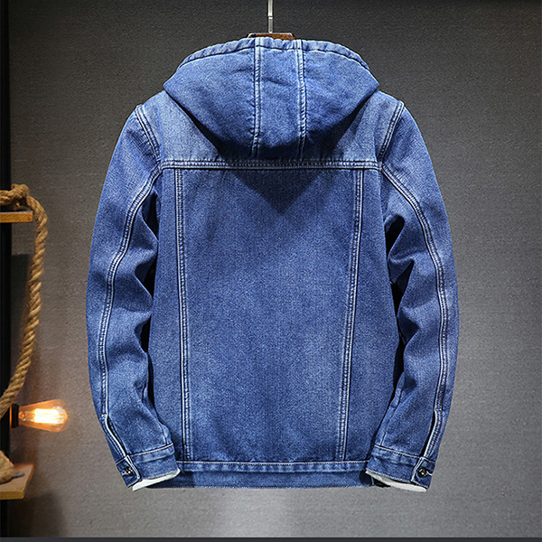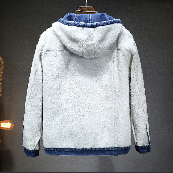 Fashion Plush Lined Drawstring Hooded Long Sleeve Old-washed Denim Jacket for Men