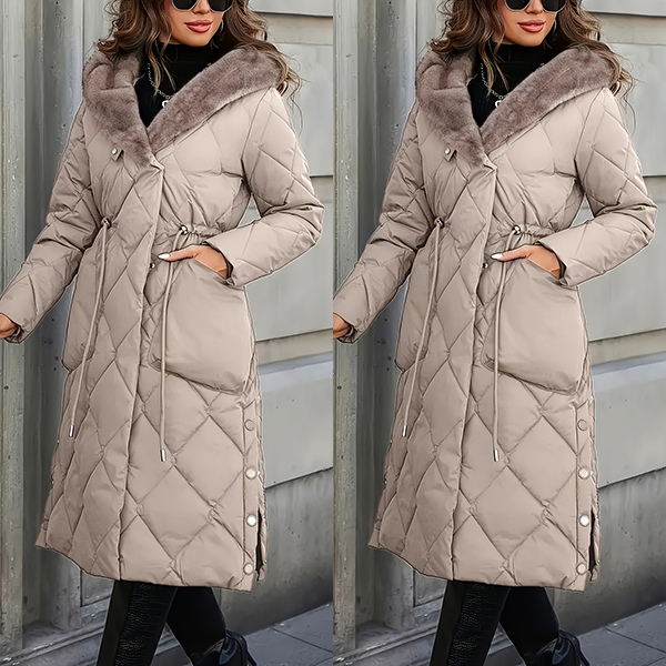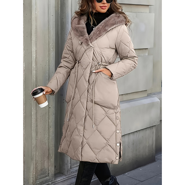 Fashion Plush Lined Long Sleeve Drawstring Waist Side Button Quilted Longline Coat