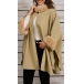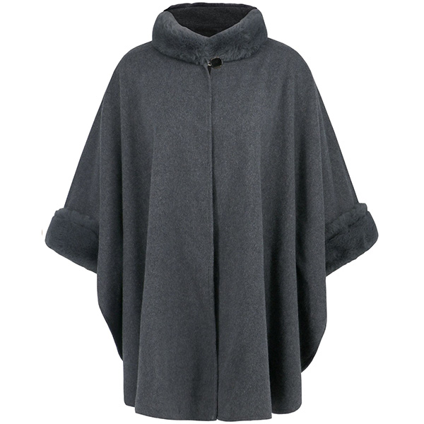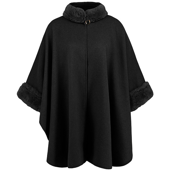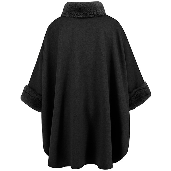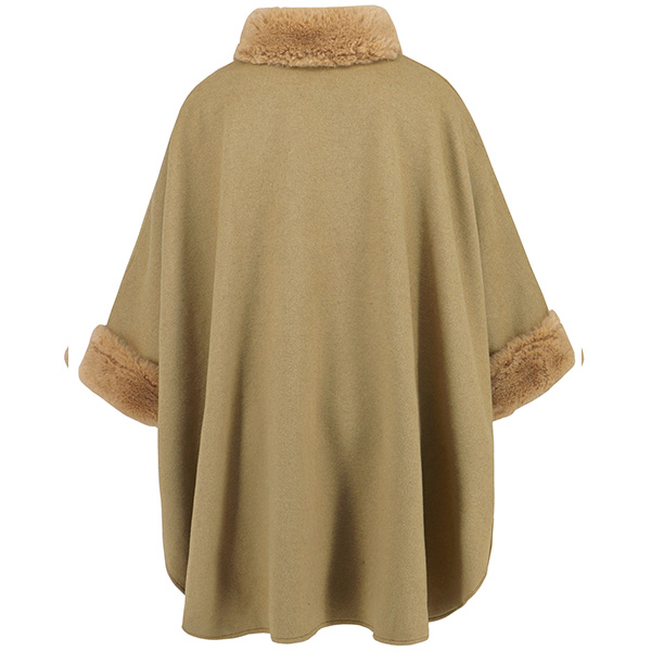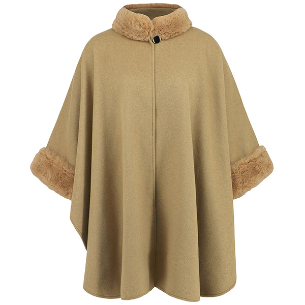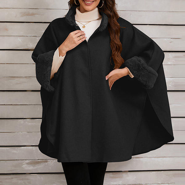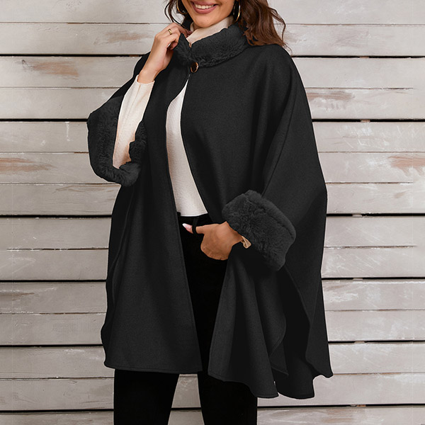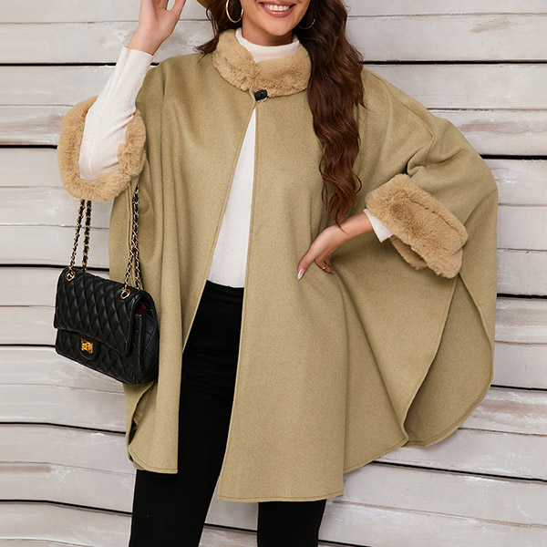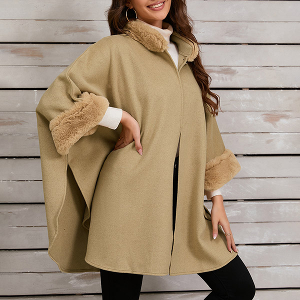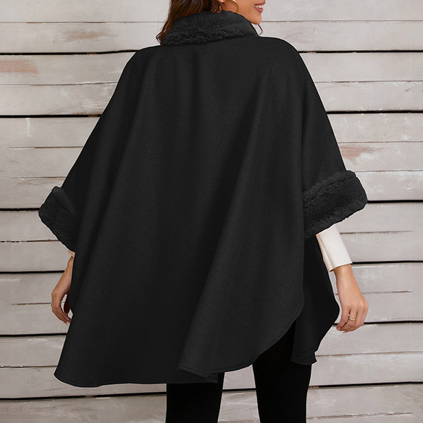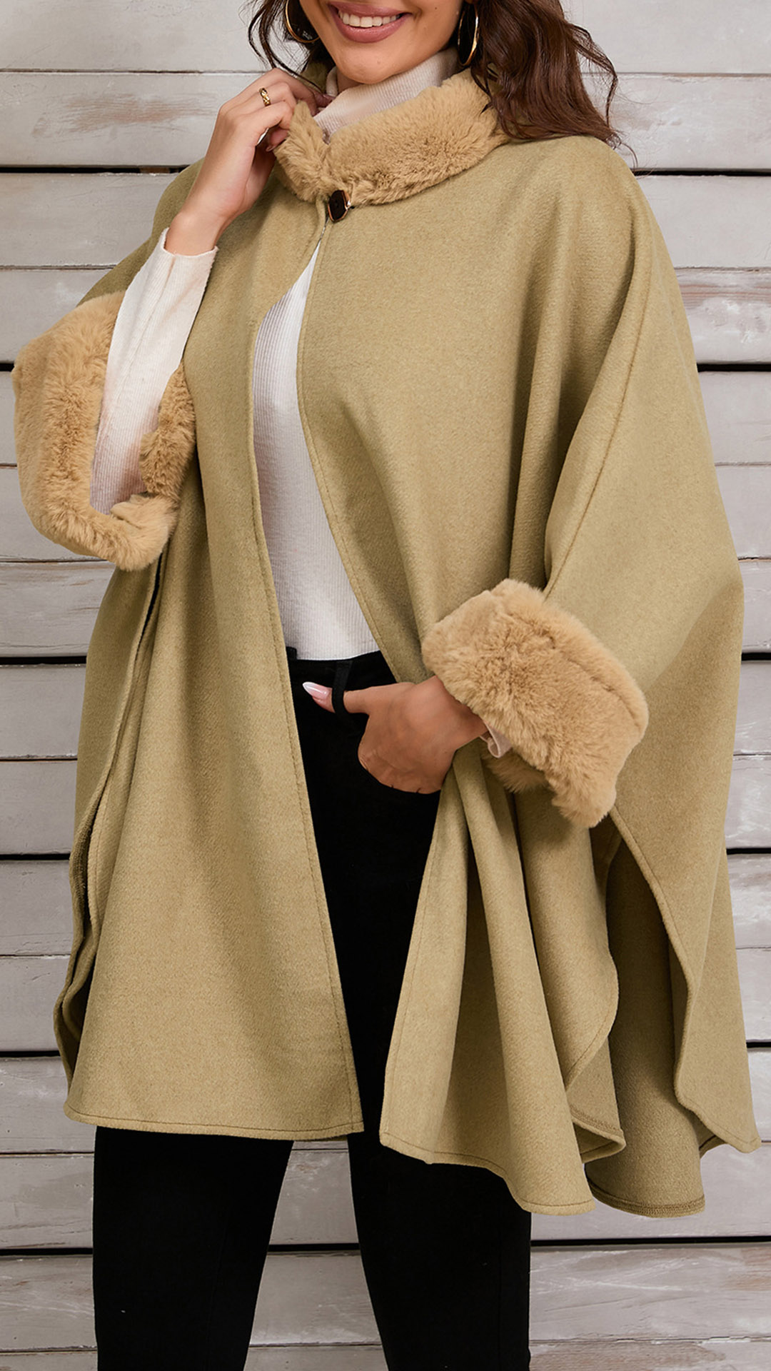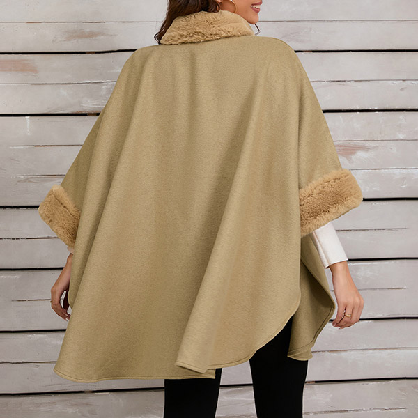How about this poncho? The plush fabric spliced along the collar and cuff, offers a soft and cozy feel, perfect for cooler weather. Crafted with side slits and a cape-style silhouette, this poncho is designed to be both fashionable and functional.