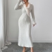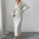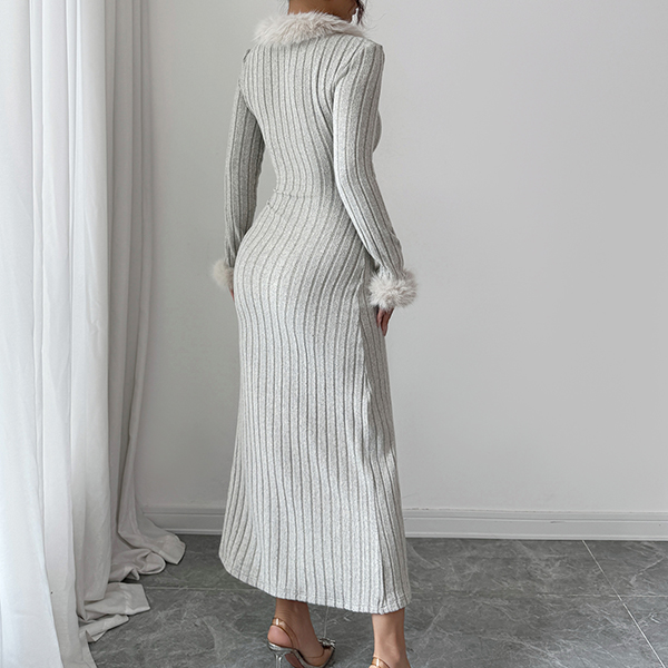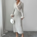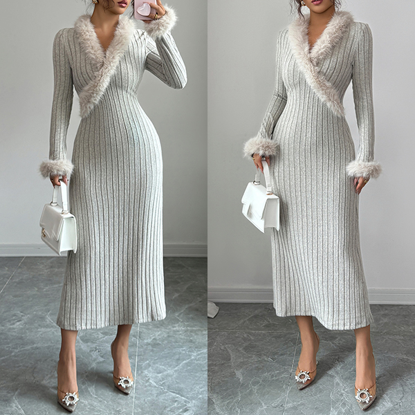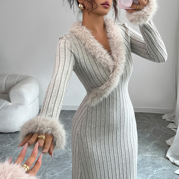 Fashion Plush Spliced V-neck Long Sleeve Ribbed Midi Dress
