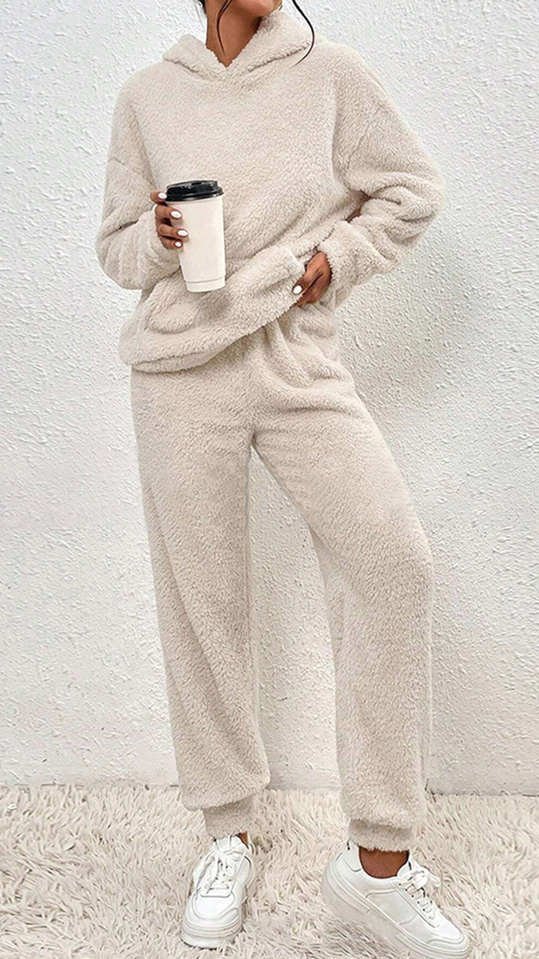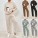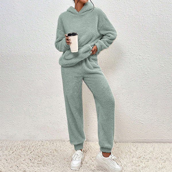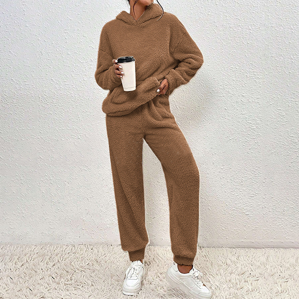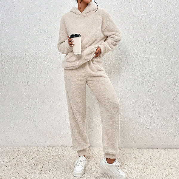 Stay cozy and on-trend with this fashionable plush two-piece set in your wardrobe. This fashionable two-piece set includes a plush hooded sweatshirt and matching pants, creating a cozy and stylish ensemble. The plush fabric adds a soft and luxurious touch to the set, making it perfect for lounging at home or running errands in comfort.