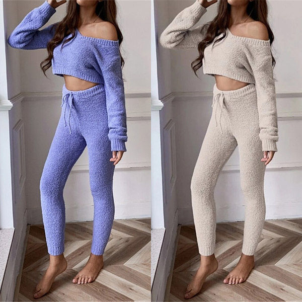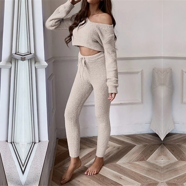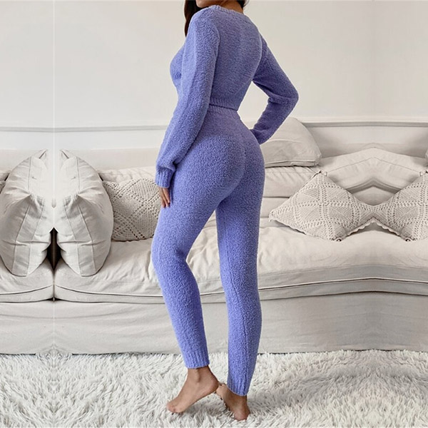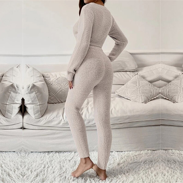 Fashion Plush Two-piece Set Consist of V-neck Crop Top and Drawstring Pants