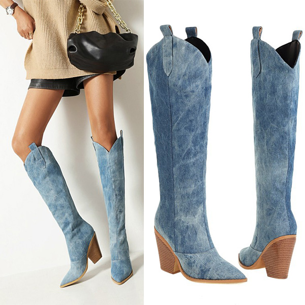 Fashion Pointed-toe Block Heeled Denim Boots