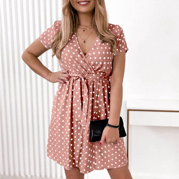 Fashion Polka-dot Printed Short Sleeve Self-tie Mini Dress