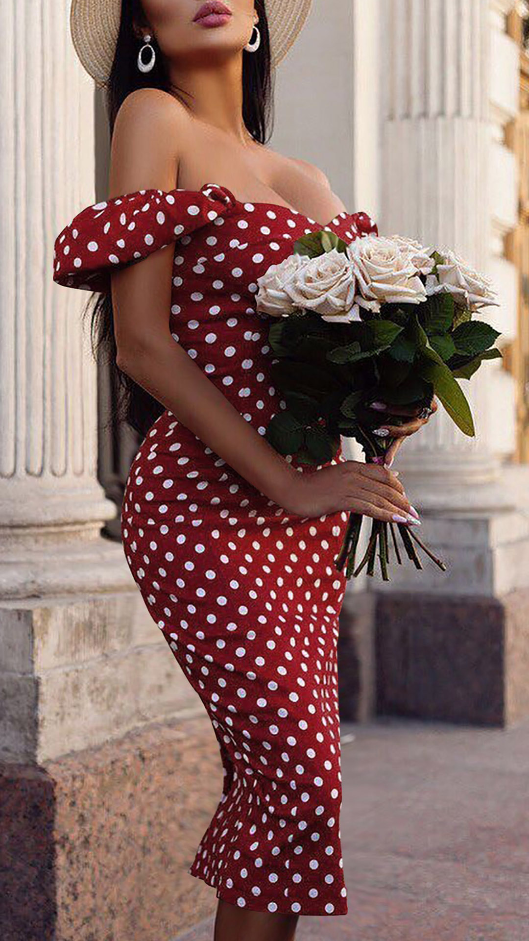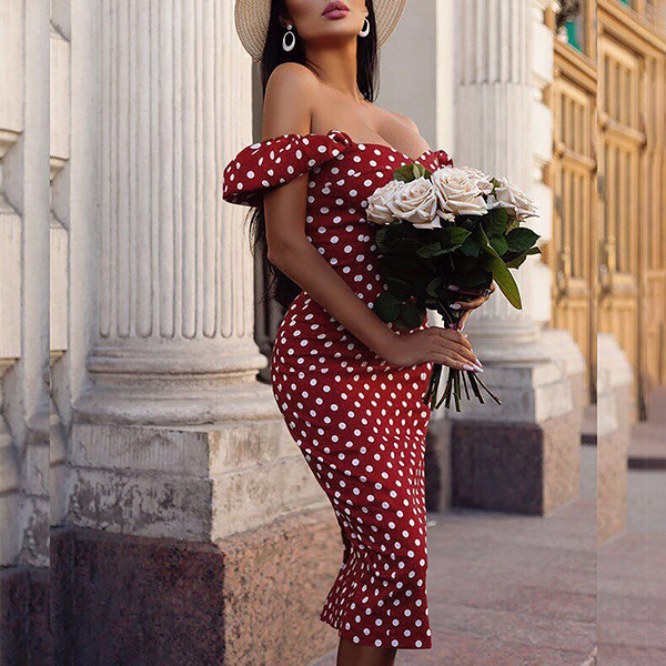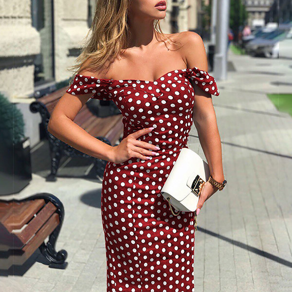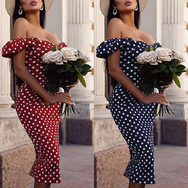 This dress features a polka-dot print design, a strapless neckline, and a bodycon silhouette for a fashionable and flirty look. Perfect for your next party wear!