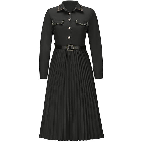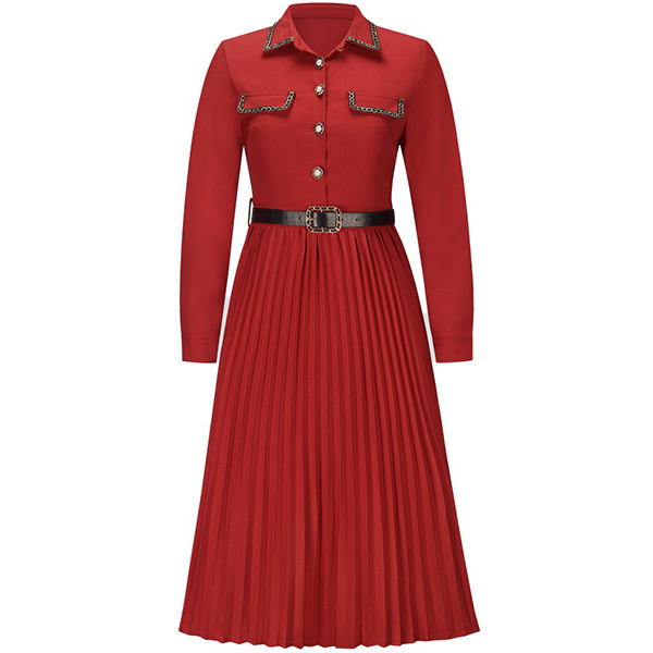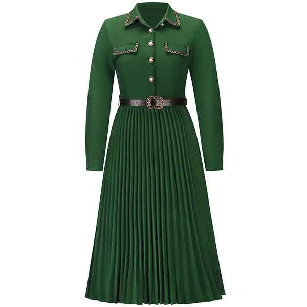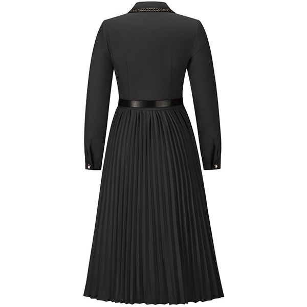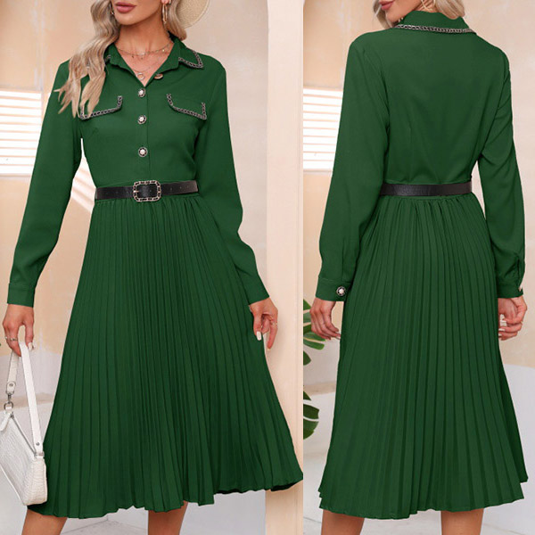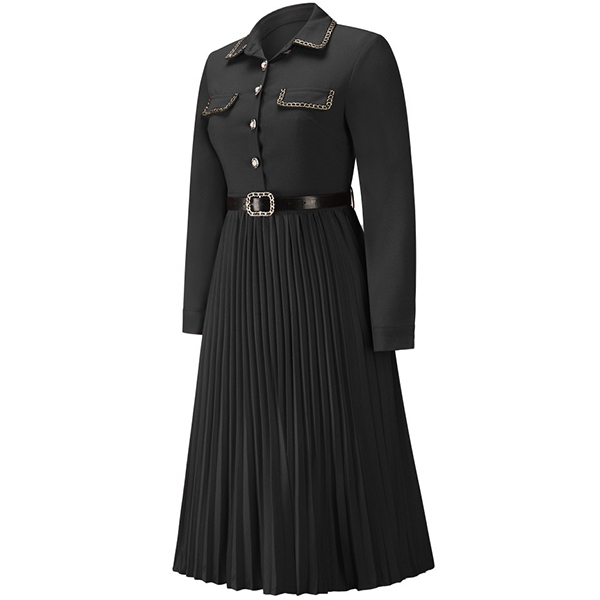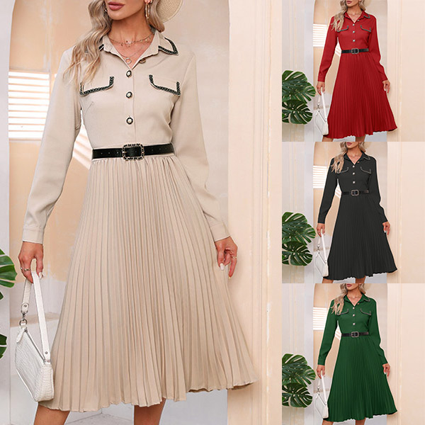 Looking for a versatile and stylish dress that can take you from the office to after-work dating? Look no further than this fashionable pleated midi dress. Made from a soft and comfortable fabric, this dress is perfect for all-day wear. The polo neck, front flap design, front buttoned design, and long sleeves give it a smart and sophisticated look, while the pleated skirt adds a touch of femininity. Dress it up with heels and a statement necklace for a night out, or keep it casual with flats and a cardigan for a day at the office.