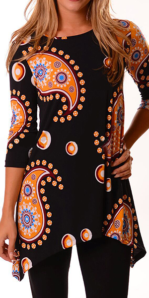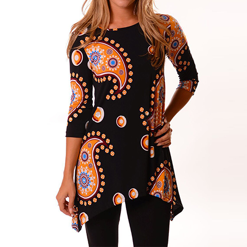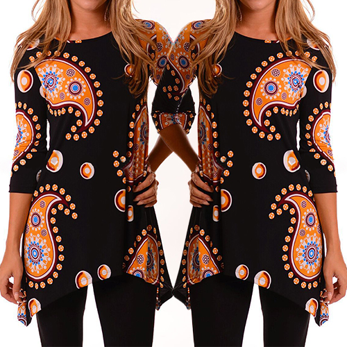 Boasting chic and eye-catching printed pattern,with 3/4 sleeve,round neck and