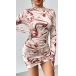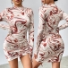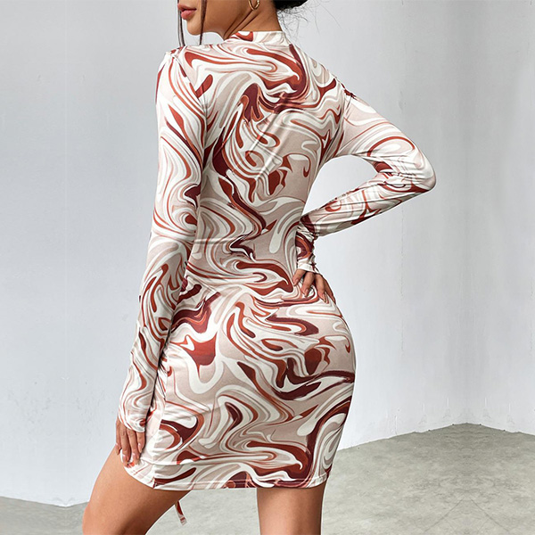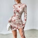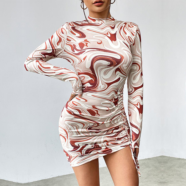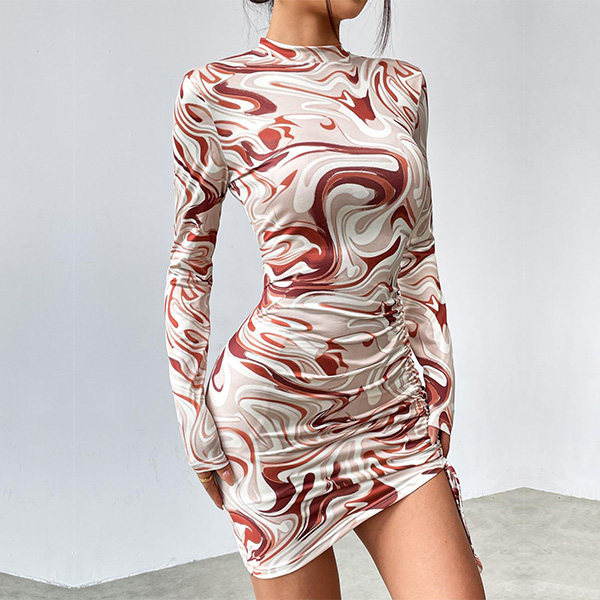 Fashion Printed Crew Neck Long Sleeve Side Drawstring Bodycon Dress