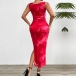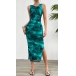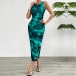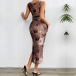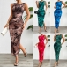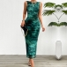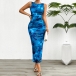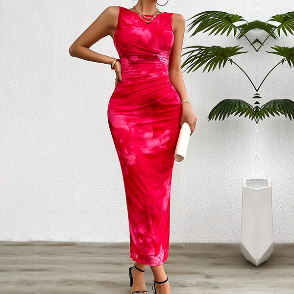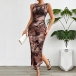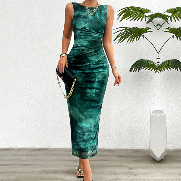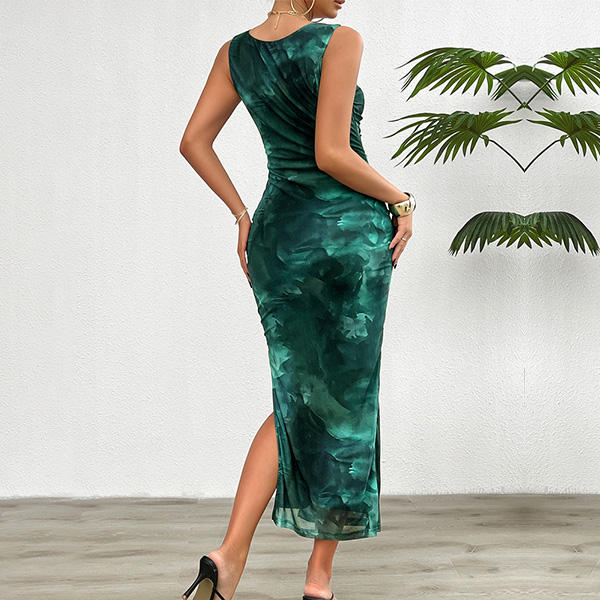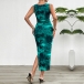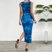 Fashion Printed Crew Neck Sleeveless Side Slit Bodycon Dress
