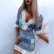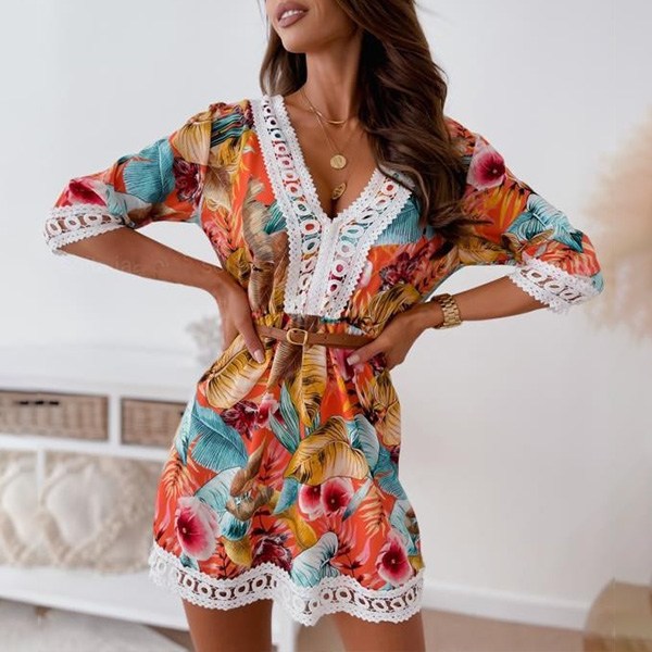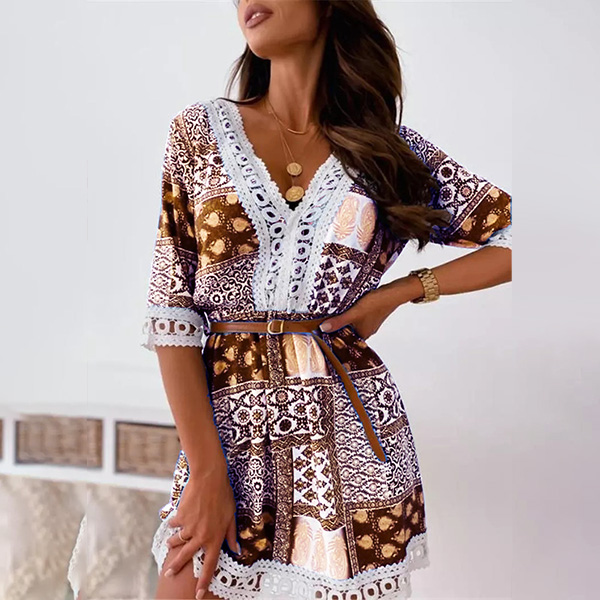 Fashion Printed Lace Spliced V-neck Short Sleeve Mini Dress