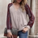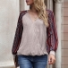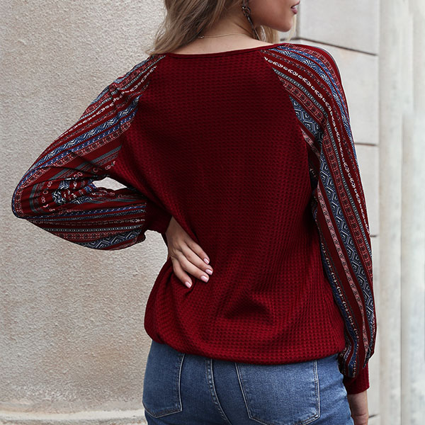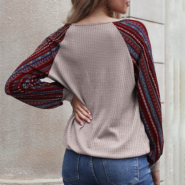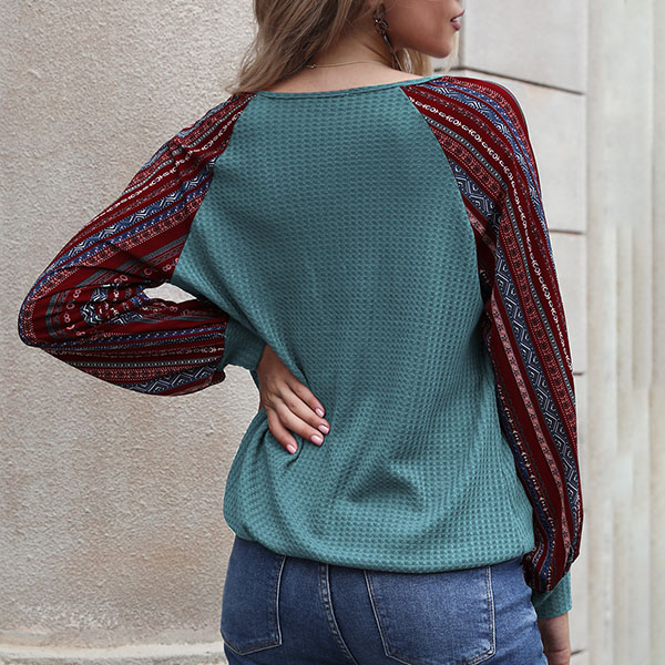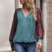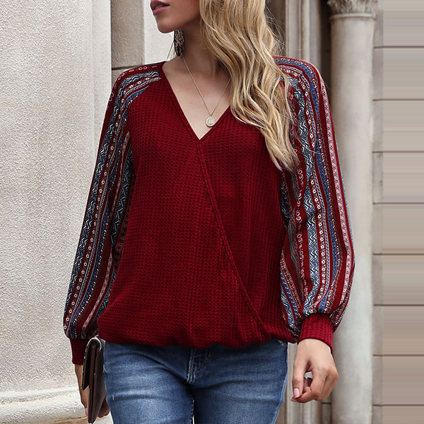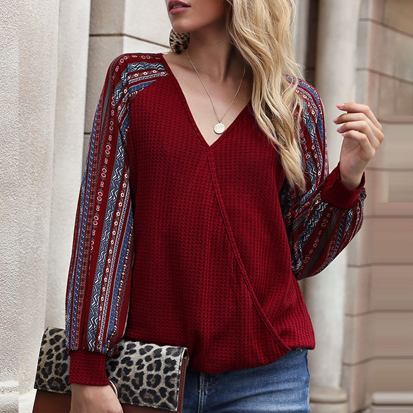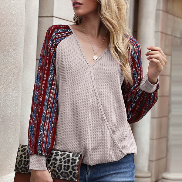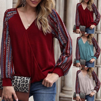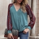 Fashion Printed Spliced Long Sleeve V-neck T-shirt