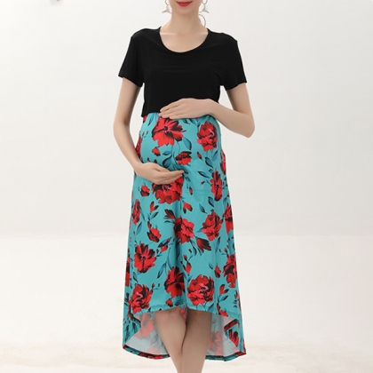 Fashion Printed Spliced Short Sleeve Round Neck Breastfeeding Dress