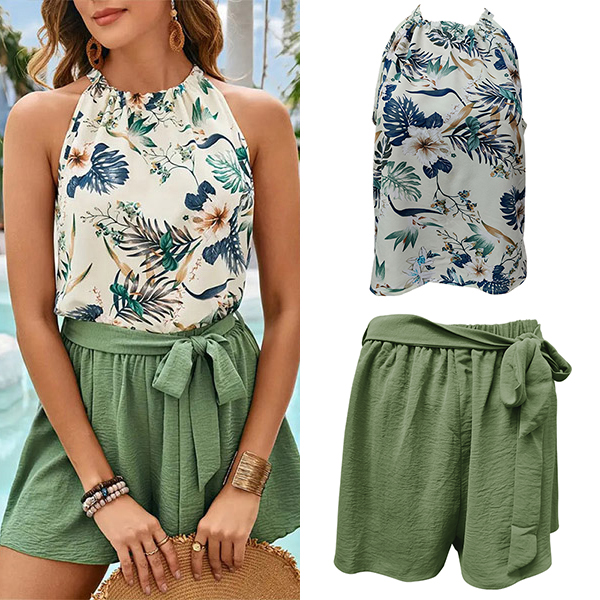 This fashionable two-piece ensemble consists of a halterneck sleeveless shirt and self-tie shorts. The halterneck top features overall floral printed and the shorts features a self-tie waist. Wanna have a try?