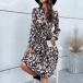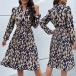 Fashion Printed V-neck Long Sleeve Ruched Self-tie Midi Dress
