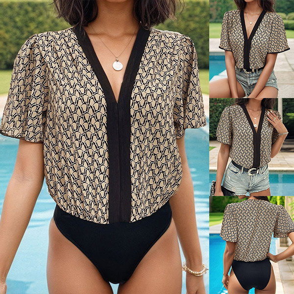 This trendy and versatile bodysuit features a printed design, a flattering V-neckline, and short sleeves, creating a fashionable and comfortable piece!