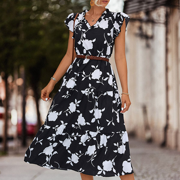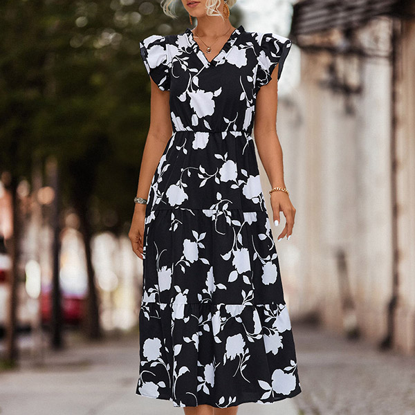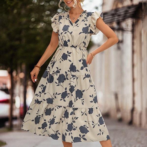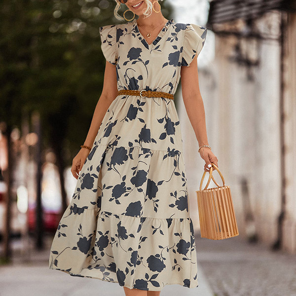 How about this dress? The printed design adds a stylish and eye-catching element, making a statement in your outfit. The V-neckline adds a touch of femininity and flatters the neckline. This dress is perfect for both casual and dressier events, allowing you to express your fashion sense effortlessly.