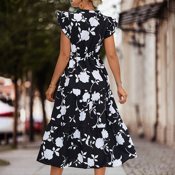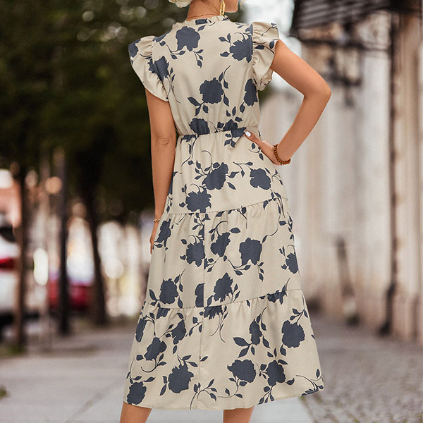Fashion Printed V-neck Short Sleeve Midi Dress