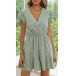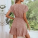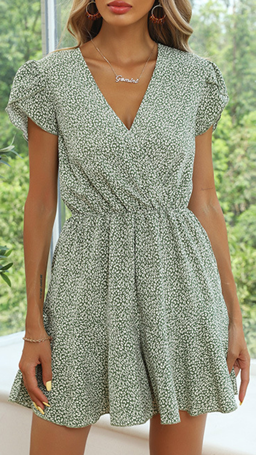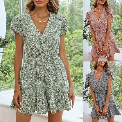 This trendy romper features a flattering V-neckline, short sleeves, and a playful printed design, making it a versatile and fashionable choice for any casual occasion.
