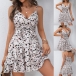 Fashion Printed V-neck Sleeveless Ruffled Self-tie Slip Dress