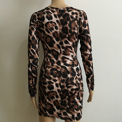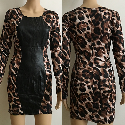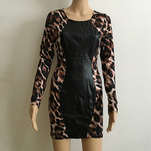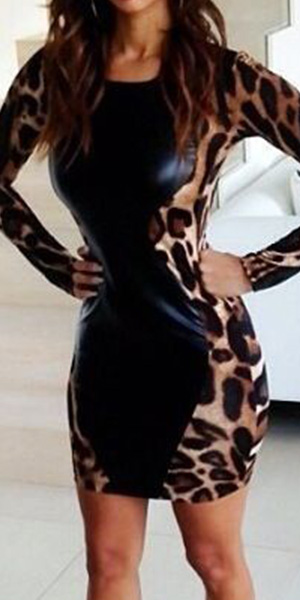 PU leather spliced style,with long sleeve,round neck and a super fit silhouette,this leopard dress