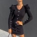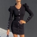Fashion Puff Sleeve Single-breasted Solid Color Slim Fit Dress