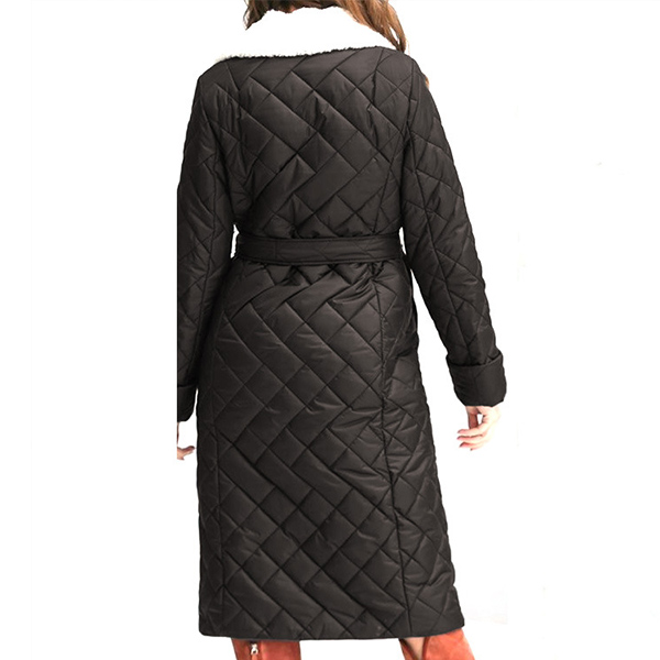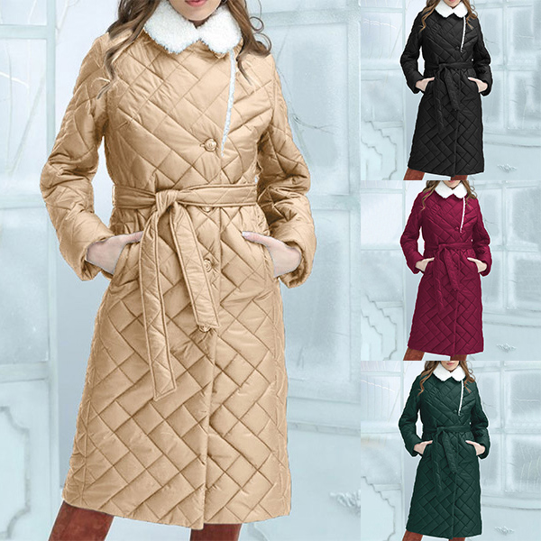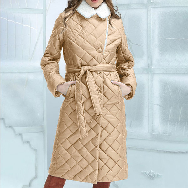 Fashion Quilted Stand Collar Long Sleeve Self-tie Plush Lined Jacket for Women