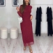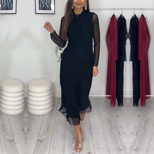 Fashion Rhinestone Crew Neck Long Sleeve Midi Dress